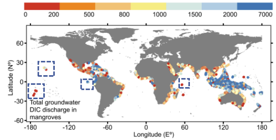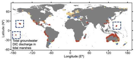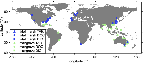 Figure 1 shows the distribution of groundwater dissolved carbon and total alkalinity data in global tidal wetlands.