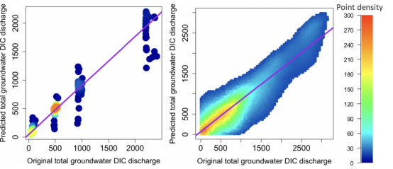 Figure 3 depicts the relationship between predicted and actual values of dissolved inorganic carbon output from global tidal wetlands through groundwater, along with the driving factors. a) and b) show the relationship for mangroves and tidal marshes, respectively, while c) outlines the driving factors for dissolved inorganic carbon output from global tidal wetlands through groundwater.