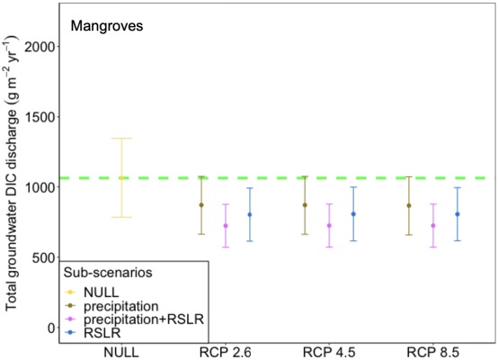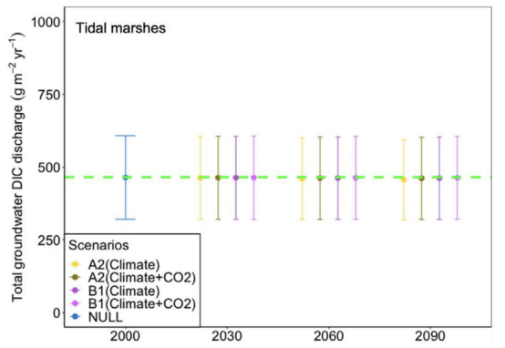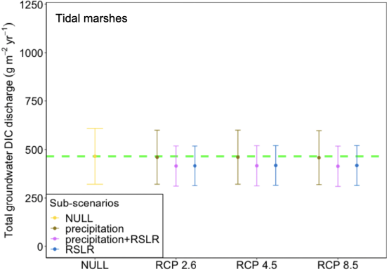 Figure 4 presents changes in dissolved inorganic carbon output from tidal wetlands through groundwater under different climate change scenarios. a) and b) represent different Representative Concentration Pathway (RCP) scenarios, while c) and d) depict scenarios with increased CO2 concentrations.