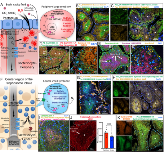 Figure 2. Host-symbiont interactions within the perphery and center “microniches” in the tubeworm’s trophosome loubles.