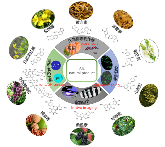 **Figure 1. Reported plant-derived AIE natural products and their applications in fluorescence sensing and bioimaging**