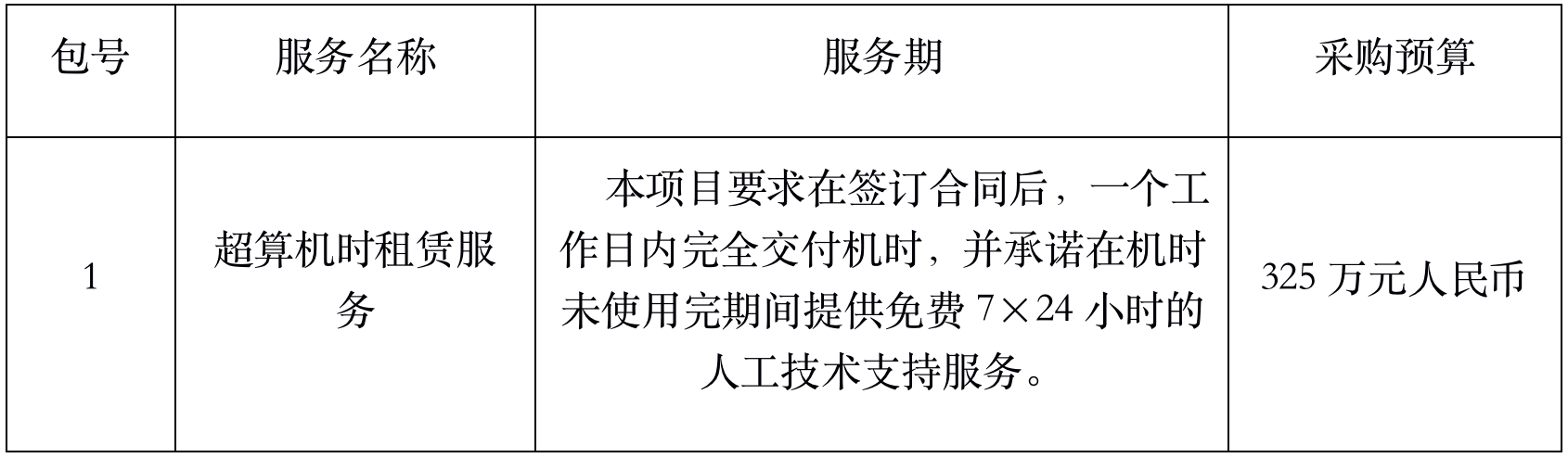 合同履行期限:本项目要求在签订合同后,一个工作日内完全交付机时,并承诺在机时未使用完期间提供免费7×24小时的人工技术支持服务