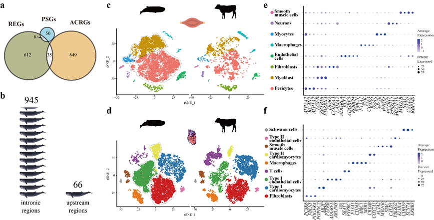 研究团队完成了小抹香鲸高质量染色体级别基因组组装,并对多个鲸类物种进行比较基因组学分析;同时,对小抹香鲸与其陆生近缘物种(牛)的心脏与骨骼肌单细胞核转录组数据进行系统比较,从细胞组成与部分细胞类型差异表达基因两条主线解析深潜鲸类低氧耐受的分子与细胞基础。