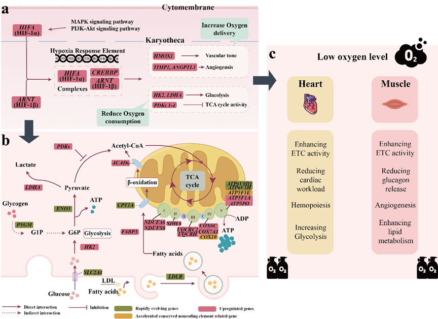 研究结果显示,深潜鲸类在多个关键生理模块上形成协同适应策略,适应信号主要集中在 HIF-1 低氧通路、线粒体电子传递链、糖酵解、脂肪酸分解代谢以及心肌功能相关调控等环节。相关基因及非编码调控元件在演化与细胞基因表达层面均呈现出与低氧耐受相一致的适应性特征。
