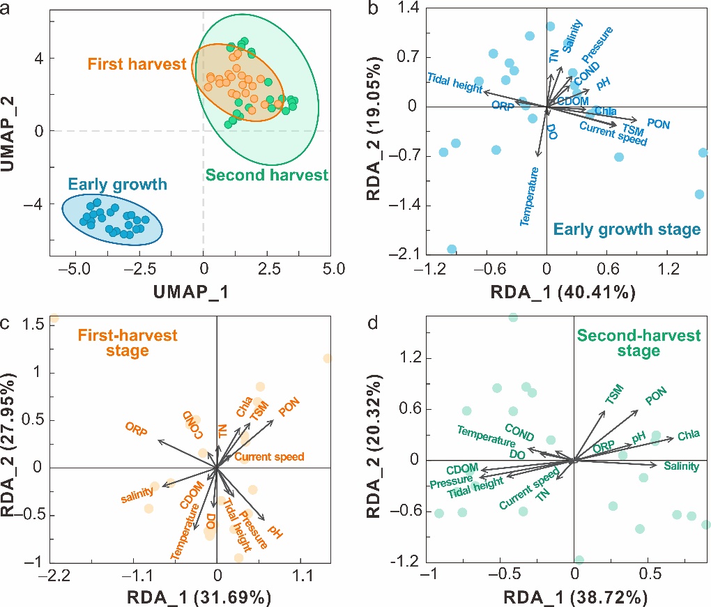 图4 不同养殖阶段碳汇指标的UMAP降维分析及碳相关变量与环境因子的冗余分析结果