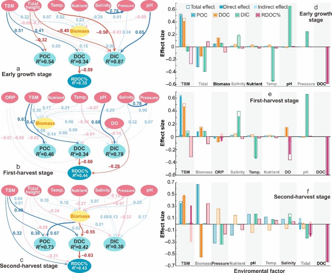 图5 分阶段PLS-PM路径分析结果(a−c)与效应分解(d−f)