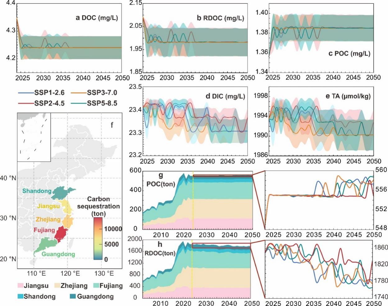 机器学习模型预测结果表明,紫菜养殖的无机碳系统对温度的敏感性显著高于有机碳库(图6)。在未来变暖情景下,无机碳库在1.7~2°C的温度阈值附近表现出非线性响应,这反映了温度依赖性生物吸收与温度控制的碳酸盐平衡共同作用的结果。将同一随机森林模型框架外推至中国沿海的紫菜养殖,分析表明,即使在高排放情景下,紫菜养殖产生的有机碳封存仅轻微减少,下降幅度< 5%。综上,我们的结果表明,紫菜养殖不仅能产生显著的碳封存效益,其碳汇功能面对气候变化具有较高韧性(图7)。这些发现为将大型藻类养殖纳入蓝碳行动计划和碳抵消倡议提供了重要的科学依据。