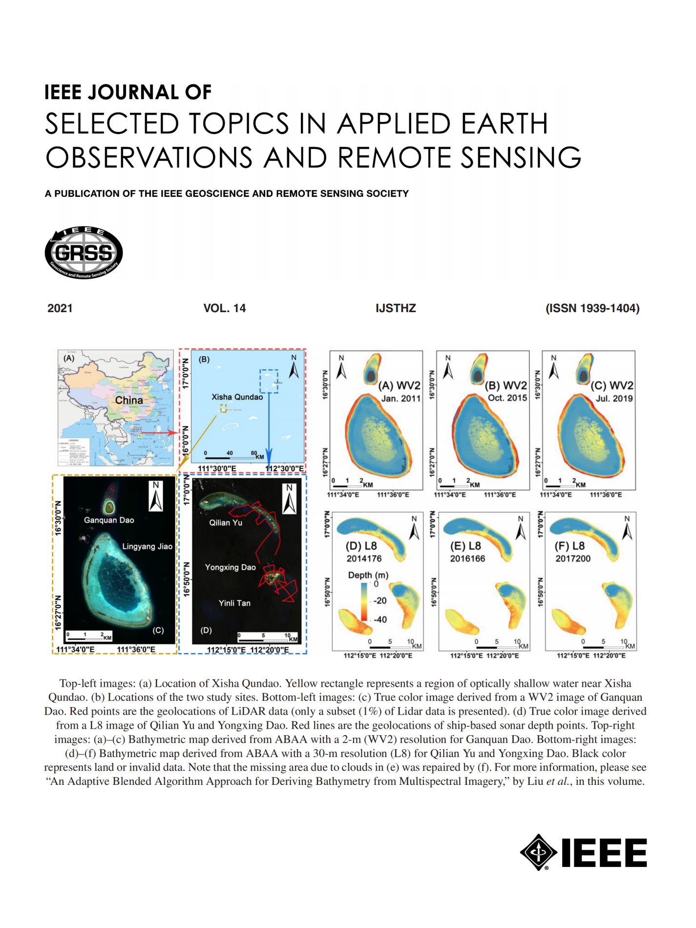 近日,广州海洋实验室“南海生态环境权益综合研究”项目负责人唐丹玲在珊瑚礁光学浅水高空间分辨率水深遥感反演方面的研究取得系列成果,最近一篇论文“An adaptive blended algorithm approach for deriving bathymetry from multispectral imagery”在知名期刊IEEE Journal of Selected Topics in Applied Earth Observations and Remote Sensing上发表,并入选封面文章。