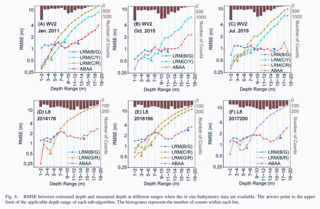 刘永明博士(第一作者)和唐丹玲教授(通讯作者)等基于光学浅水反射率模型的参数敏感性分析结果,构建自适应的水深分段反演模型(ABAA, adaptive blended algorithm approach),使遥感影像上不同水深范围内的像元能够被最佳波段组合的反演模型提取水深,从而提高水深反演精度。该研究以南海西沙群岛的甘泉岛、银砾滩、七连屿和永兴岛作为研究区域,将ABAA模型应用于多时相的WorldView-2和Landsat-8数据进行水深反演。当使用实测水深数据对ABAA进行定标时,ABAA显著的提高了水深反演的精度,尤其是小于 6 m的水深范围。