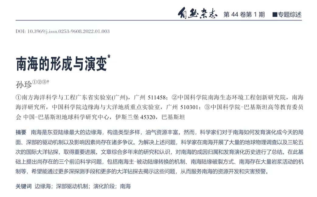 近日,广州海洋实验室孙珍研究员今年发表在《自然杂志》上的封面文章《南海的形成与演变》,被我国著名社科类期刊《新华文摘》作为封面论文全文转载。