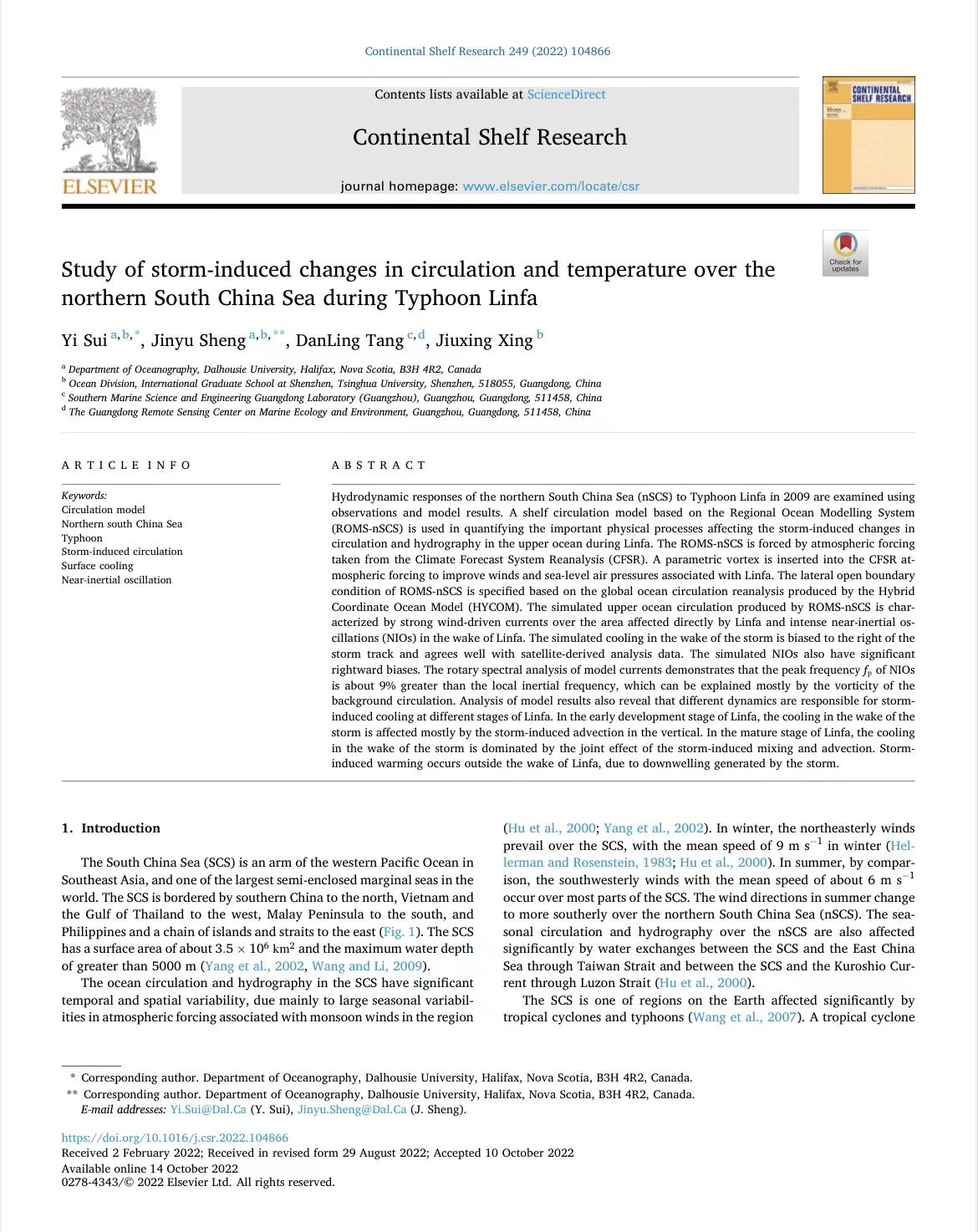 近日,广州海洋实验室在海洋生态环境对台风的响应研究取得进展,相关成果以“Study of storm-induced changes in circulation and temperature over the northern South China Sea during Typhoon Linfa”为题发表于海洋学领域SCI期刊Continental Shelf Research上。论文第一作者和通讯作者分别为加拿大达尔豪斯大学Yi Sui 隋艺和Jinyu Sheng 申锦瑜教授,合作者有广州海洋实验室教授、广东省海洋生态环境遥感中心主任Danling Tang 唐丹玲博士和清华大学国际研究生院Jiuxing Xing 邢久星教授。