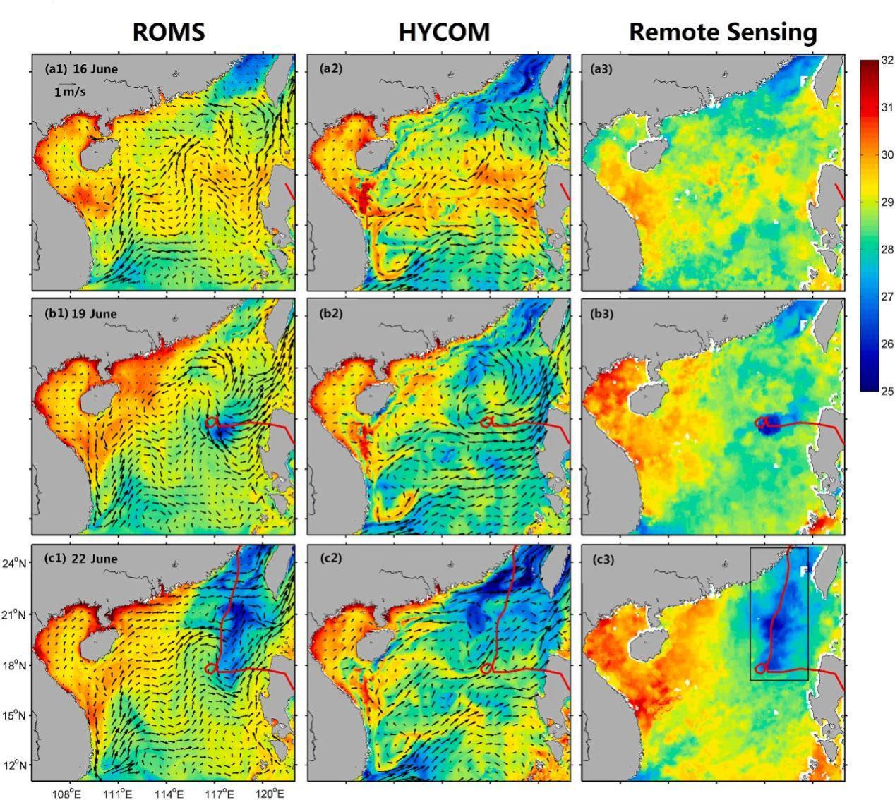 Fig. 5. Distributions of daily mean sea surface temperatures (SSTs) and surface currents produced by (left panels) the ROM-nSCS and (middle panels) HYCOM reanalysis and (right panels) SSTs calculated from the daily satellite remote sensing data on (top) 16, (central) 19, and (bottom) 22 June 2009. For clarity, surface current vector in right (middle) panels are plotted at every 9th (6th) model grid point of the ROMS-nSCS (HYCOM). The black box in c3 shows the region of AADL.