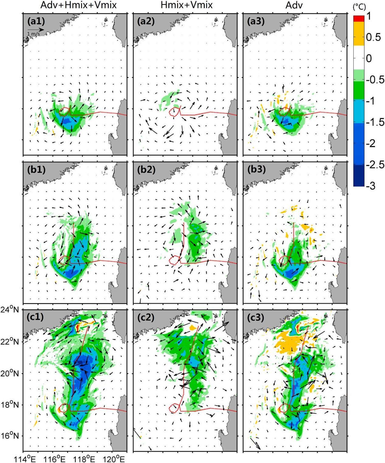 Fig. 13. Distributions of (a1,b1,c1) ΔU→A+M and ΔTA+M, (a2,b2,c2) ΔU→M and ΔTM, and (a3,b3,c3) ΔU→A and ΔTA at the sea surface at 00:00 on (a1-3) 19, (b1-3) 20 and (c1-3) 21 June 2009, respectively. The red dashed line in each panel represents the storm track. For clarity, surface current vectors are plotted at every 9th model grid point.