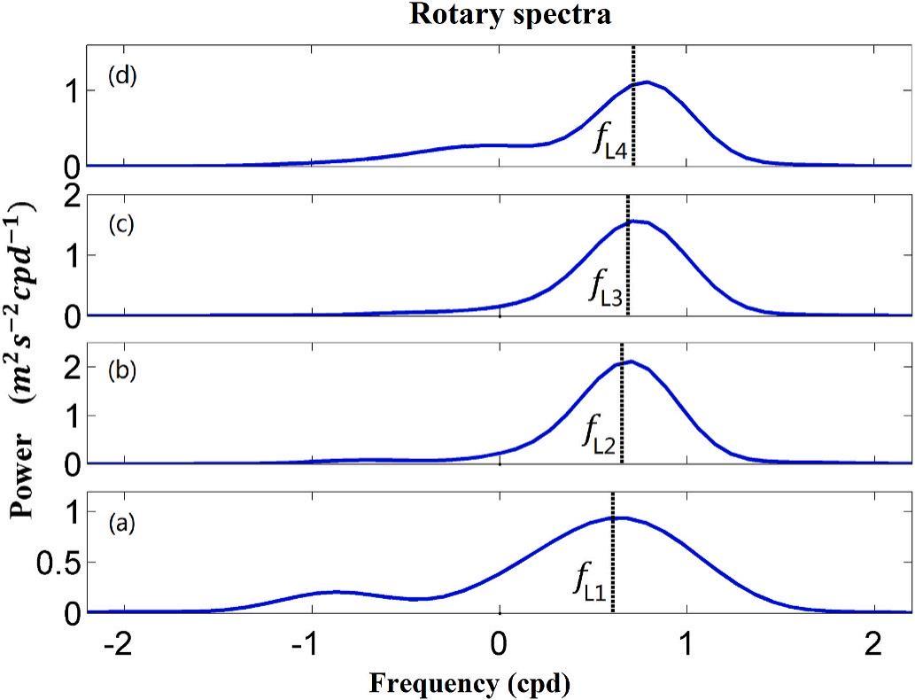 Fig. 16. Rotary spectra of simulated surface currents at locations (a) L1, (b) L2, (c) L3, and (d) L4. The vertical dashed line in each panel represents the local inertial frequency at the location. The negative frequency represents the counterclockwise components.