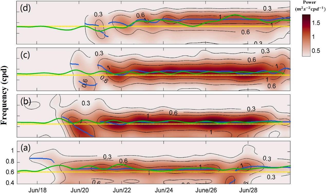 Fig. 17. Evolving rotary spectra of simulated surface currents at locations (a) L1, (b) L2, (c) L3, and (d) L4. In each panel, the green line represents the effective frequency (fe = f + ζ /2), the yellow dashed line represents the local inertial frequency (f), and the blue line represents the peak frequency (fp) at each location. ERS are calculated using a 10-day sliding window. The frequency axis is limited to the near-inertial band.
