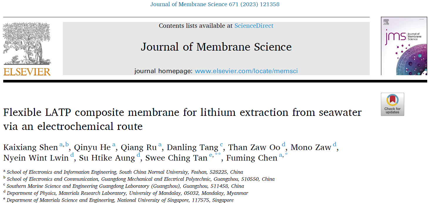 文章信息:Kaixiang Shen, Qinyu He, Qiang Ru, Danling Tang, Than Zaw Oo, Mono Zaw, Nyein Wint Lwin, Su Htike Aung, Swee Ching Tan, Fuming Chen*,“Flexible LATP composite membrane for lithium extraction from seawater via an electrochemical route”, Journal of Membrane Science, Volume 671, 2023, Article ID 121358, ISSN 0376-7388, https://doi.org/10.1016/j.memsci.2023.121358.