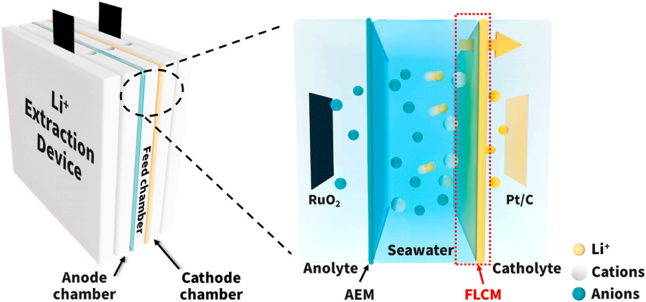 为了解决锂资源紧张的问题,从含有大量锂元素的海水中提取锂的策略受到了广泛的关注。然而,由于海水中锂的浓度很低(大约0.1-0.2 ppm)并且存在许多杂质离子,例如Ca2+和Mg2+等,这项任务具有挑战性。
