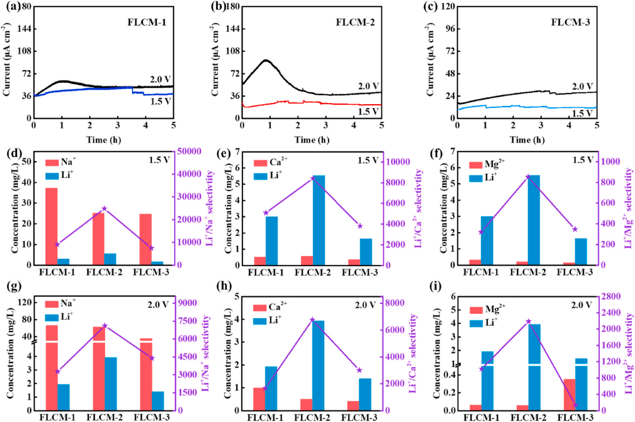 图2(a-c)不同电压下FLCM-1、FLCM-2和FLCM-3的电流密度与时间的曲线。在1.5V(d-f)和2.0V(g-i)时,钙溶液中Li+、Na+、Ca2+和Mg2+的浓度以及相应的Li+/Na+、Li+/Ca2+和Li+/Mg2+的选择性