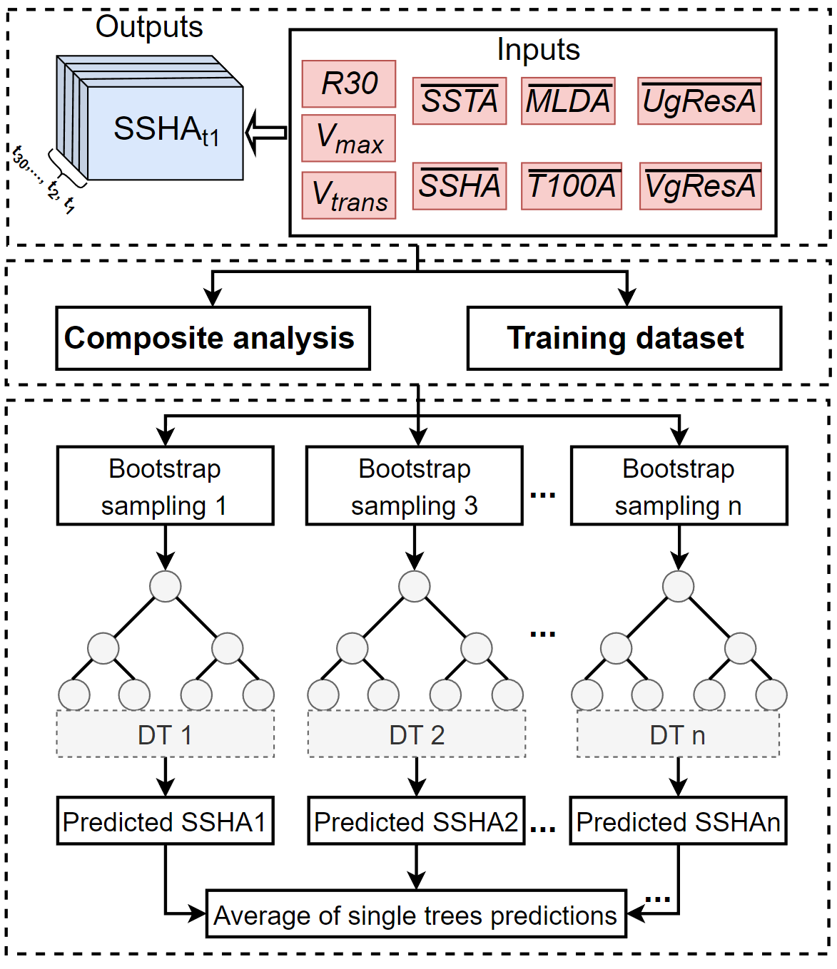 热带气旋(TC)风泵作用引起的海面高度异常(SSHA)与振荡密切相关,是上层海洋中热层结构和海洋热含量的重要表征参数。然而,对热带气旋引起的海表高度异常的预测很少被研究。该研究提出了一种新的基于复合分析的随机森林(RF)方法来预测热带气旋诱发的海表高度异常,即利用热带气旋的特征和风暴前的上层海洋参数作为输入特征,预测热带气旋通过后30天内诱发的每日的海表高度异常。模拟结果表明,本方法能够准确地推断出不同强度组的热带气旋所引起的海表高度异常的振幅和时间演变。使用以热带气旋为中心的5°×5°的区域平均值,所提出的方法对热带气旋诱发的西北太平洋的海表高度异常进行了准确的预测,均方根误差为0.024m,优于其他机器学习方法和数值模式。此外,所提出的方法在不同的地理区域,如中国南海和北太平洋西部亚热带海域也表现出良好的预测性能。