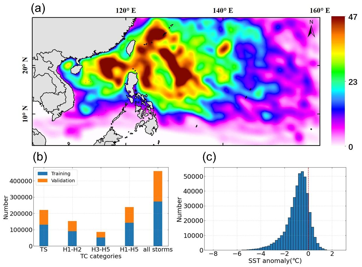 Figure 1. Study area and distribution of data points in the training and validation sets during January 1998–December 2018. (a) TC occurrence density, calculated as the number of TC occurrence during the entire study period within individual 0.1°×0.1° grids. (b) Histogram of the number of data points used in the training stage as a function of TC intensity. (c) Histogram of TC-induced SST anomalies on day 1 after TC passage in the training stage. Abbreviations: TS, tropical storm; H1–H2, category-1–2 hurricane; H3–H5, category-3–5 hurricane; and H1–H5, category-1–5 hurricane.