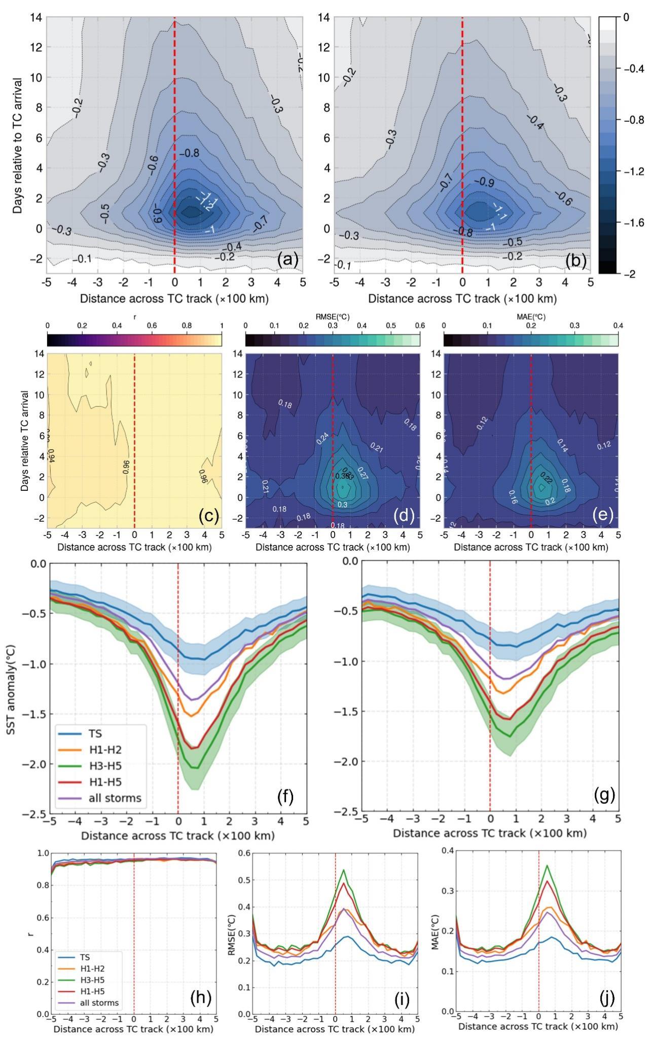 Figure 2. (a) Spatial structure and temporal evolution of the TC-induced SST anomalies (℃) in the observations from the testing set. (b) As in (a), but for the predictions. (c)-(e) Evaluation of the model performance for (b), i.e., (c) correlation coefficient r, (d) RMSE (℃), and (e) MAE (℃). (f) TC-induced SST anomalies in the observations as a function of the distance across TC track on the day right after the cyclone passage when the SST anomaly near the storm center peaks. Only the standard errors for TS and H3–H5 are shown (light blue and light green shading, respectively), and are calculated as the standard deviation divided by the square root of the number of observations used in the testing stage (i.e., standard error of the mean); the size of the standard errors for the other three intensity groups is in between these two. (g) As in (f), but for the predictions. (h)-(j) Evaluation of the model performance for (g), i.e., (h) correlation coefficient r, (i) RMSE (℃) and (j) MAE (℃), for different TC intensity groups.
