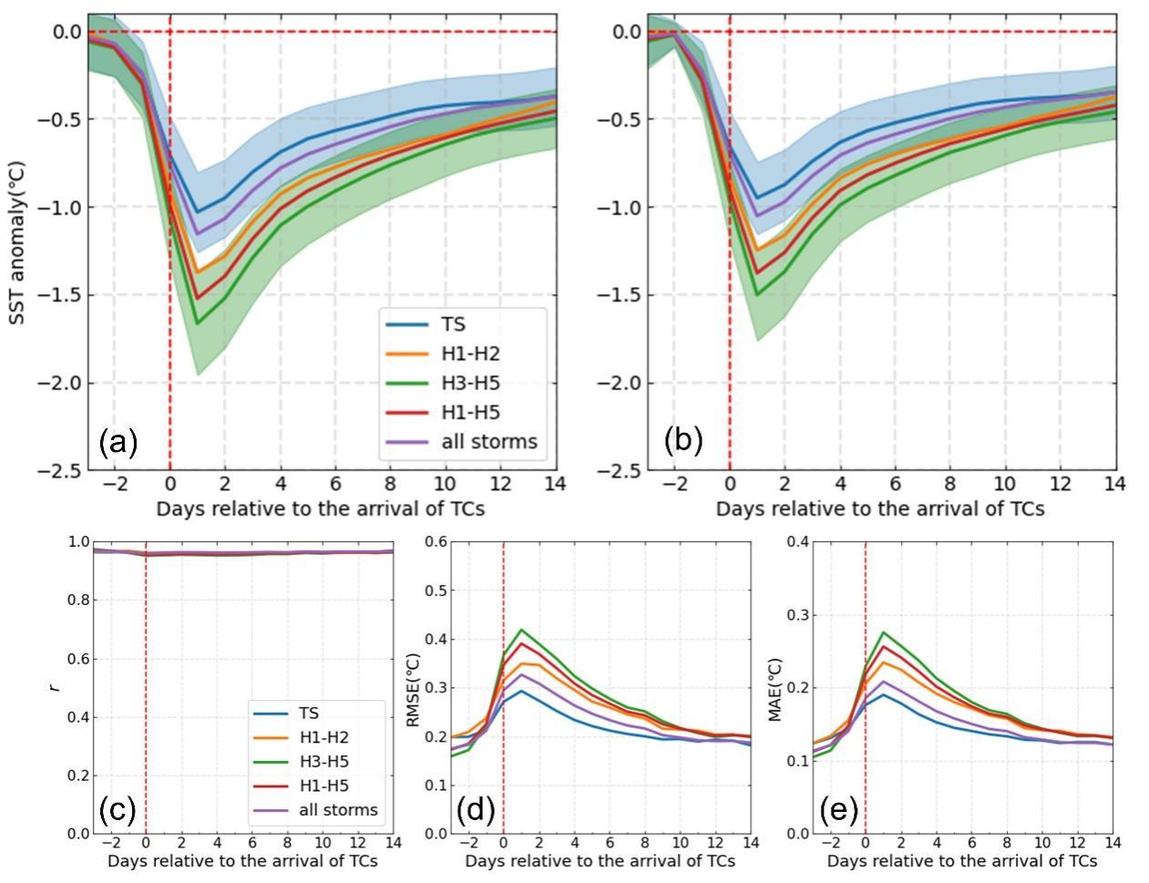 Figure 3. (a) Temporal evolution of the composite SST anomaly averaged within a TC-centered 3°×1° box in association with the passage of TCs of different intensity groups in the observations from the testing set. The standard errors for TS and H3–H5 are calculated and shown as in Figure 2(f). (b) As in (a), but for the predictions. (c)-(e) Evaluation of the model performance for (b), i.e., (c) correlation coefficient r, (d) RMSE (℃) and (e) MAE (℃), for different TC intensity groups.