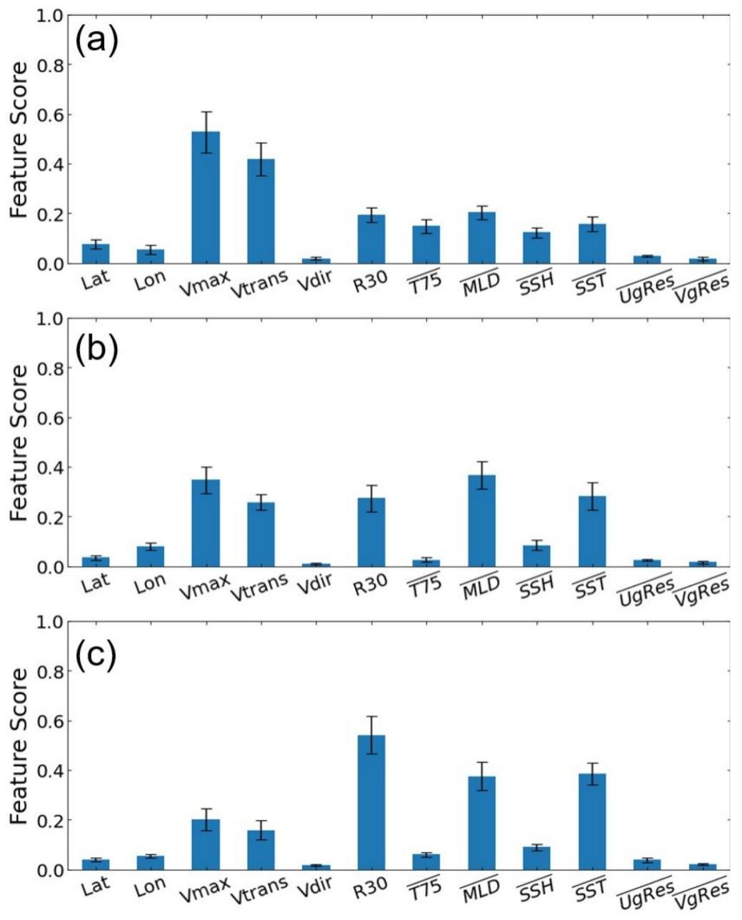 Figure 4. (a) The feature scores of the 12 predictors used in the model constructed to predict the maximum SST cooling induced by TCs averaged within a TC-centered 1°×1° box. (b),(c) As in (a), but for the model constructed to predict the maximum SST cooling induced by TCs averaged within TC-centered 3°×3° and 5°×5° boxes, respectively. Vertical lines show the standard deviations of the feature scores.
