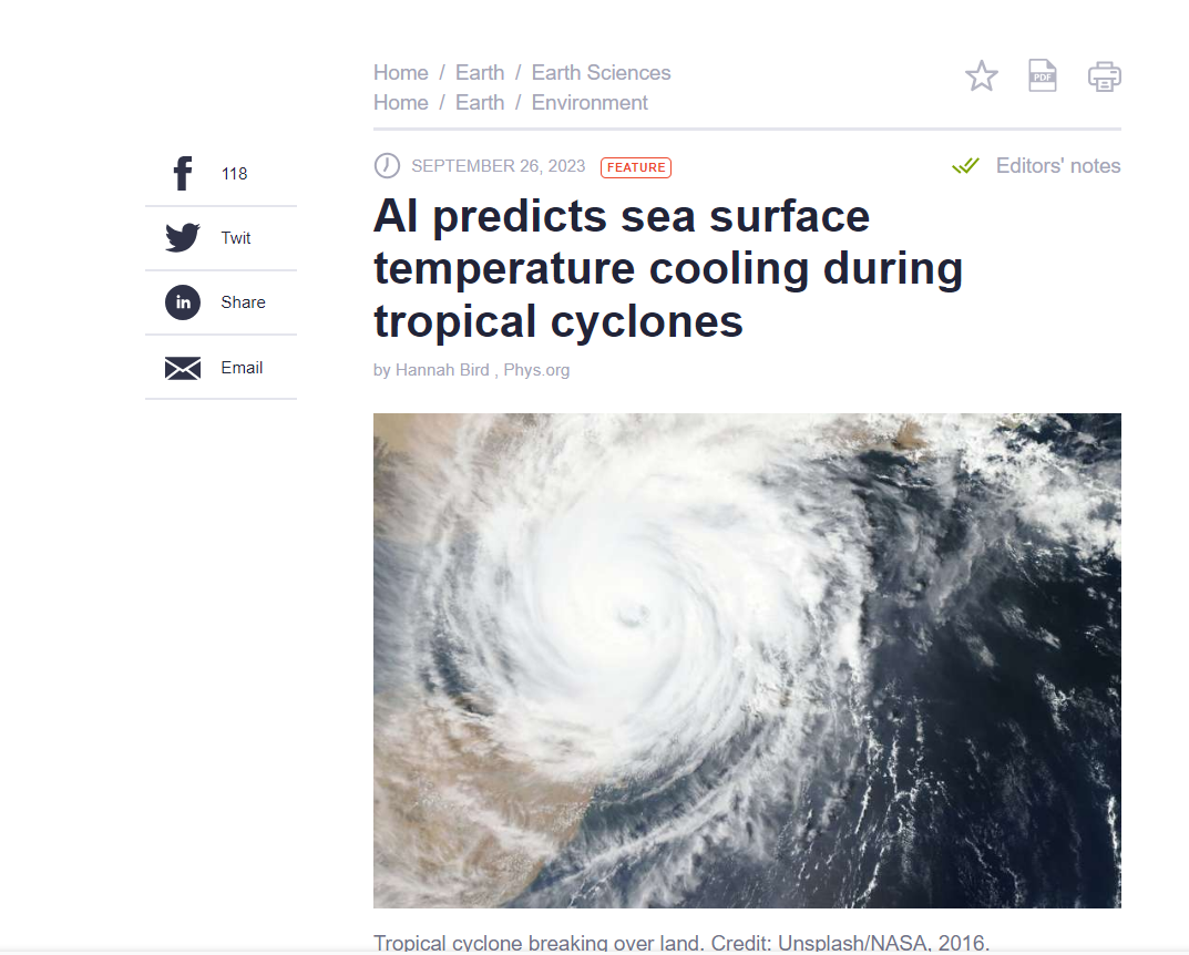 近日,广州海洋实验室唐丹玲U团队利用机器学习预测热带气旋风泵引起的海表温度响应研究取得进展,相关成果以“Predicting tropical cyclone-induced sea surface temperature responses using machine learning”为题发表在SCI 1区期刊Geophysical Research Letters(影响因子:5.2)上,并作为亮点新闻被Phys.org与CityLife等多家国际科研资讯媒体报道。论文第一作者为广州海洋实验室-香港科技大学联培博士研究生崔红星,通讯作者为广州海洋实验室教授、广东省海洋生态环境遥感中心唐丹玲博士。合作单位包括美国北卡罗来纳大学教堂山分校、加拿大达尔豪斯大学与英国肯特大学等。
