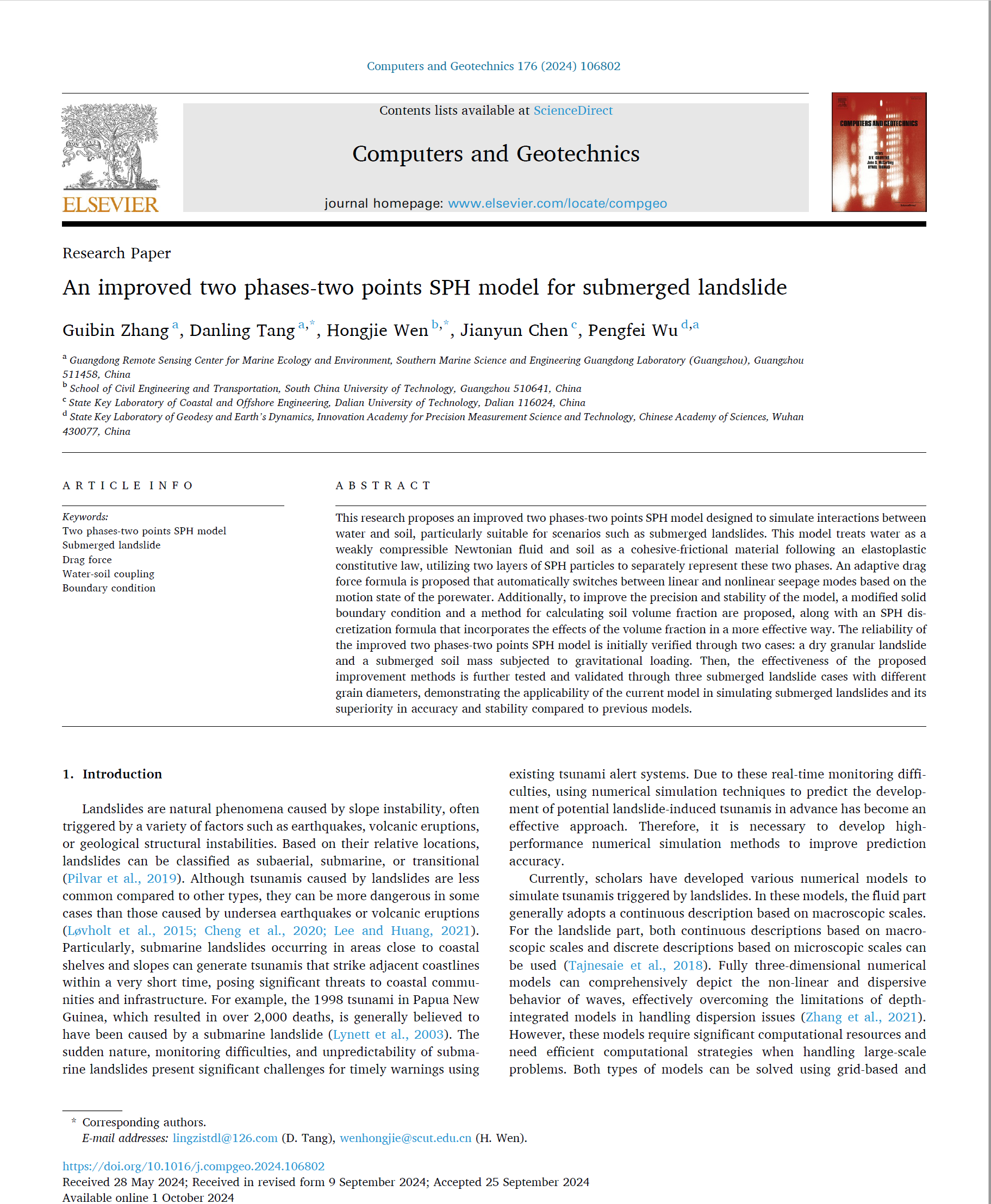 论文全文:Guibin Zhang, Danling Tang, Hongjie Wen, Jianyun Chen, Pengfei Wu. An improved two phases-two points SPH model for submerged landslide. Computers and Geotechnics, 2024, 176: 106802. https://doi.org/10.1016/j.compgeo.2024.106802