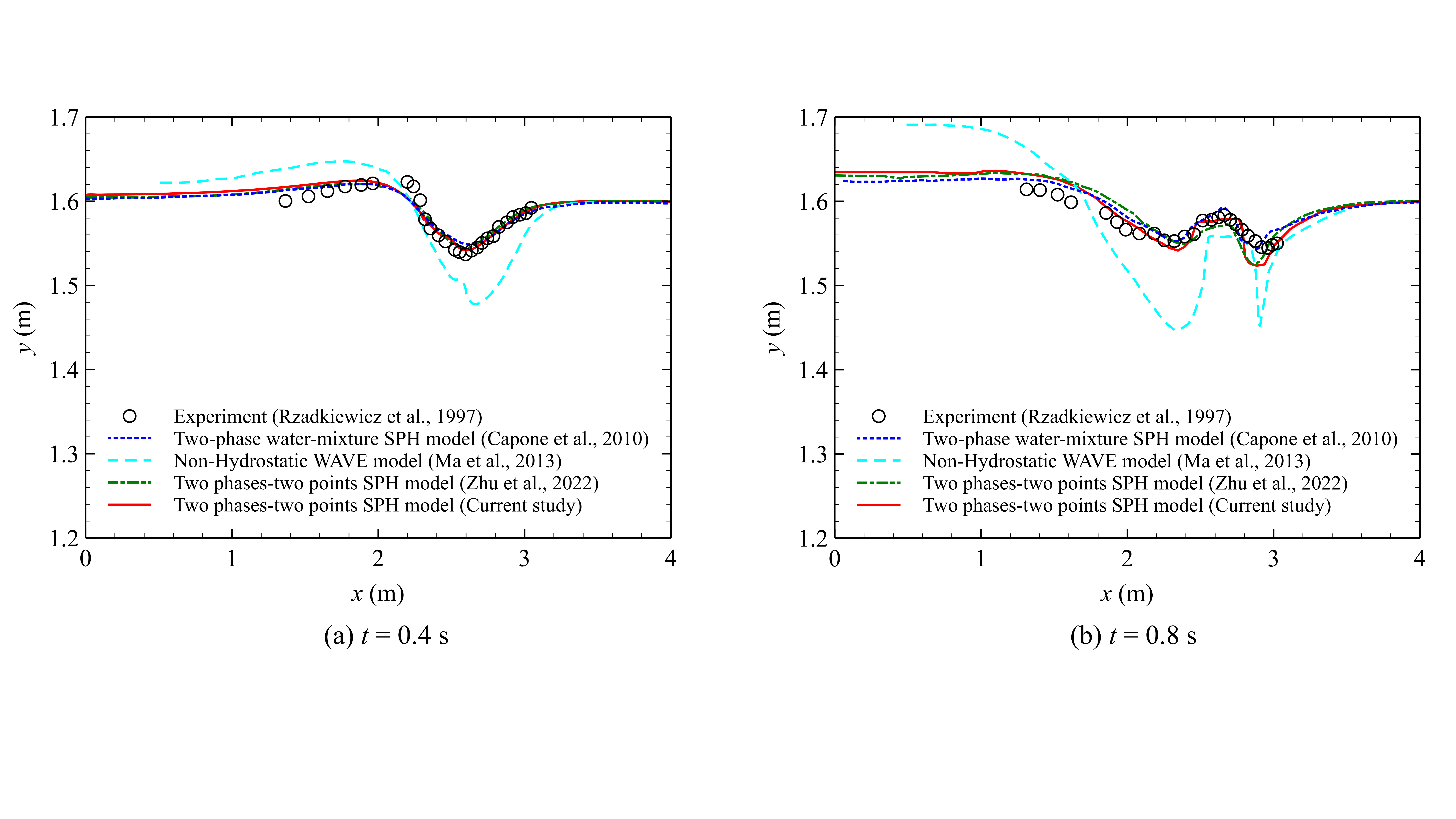 Fig. 3. Comparison of free surface shapes computed by the present model at (a) t = 0.4 s and (b) t = 0.8 s, with experimental data and results from other numerical models.