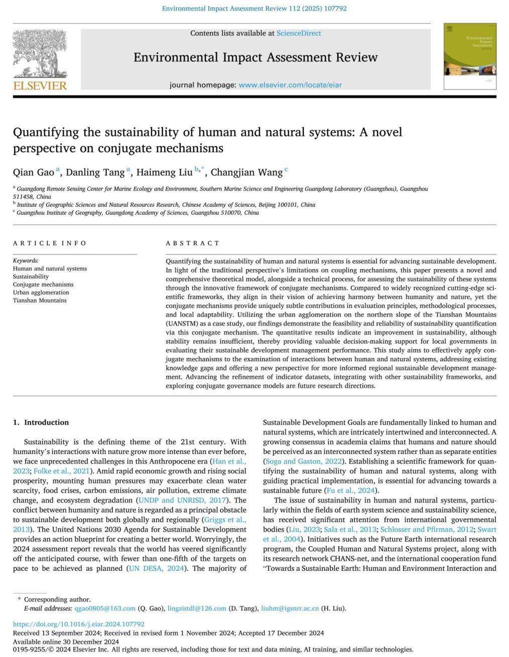 论文全文:Qian Gao, Danling Tang, Haimeng Liu, Changjian Wang. 2025. Quantifying the sustainability of human and natural systems: A novel perspective on conjugate mechanisms. Environmental Impact Assessment Review, 112, 107792. https://doi.org/10.1016/j.eiar.2024.107792.