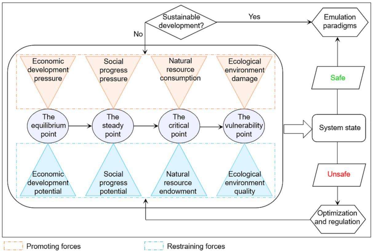 该研究的创新之处在于从共轭机制提出了一套新的更全面量化人类与自然系统可持续性的理论模型和技术流程。其知识贡献是:其一,补充阐释了人类与自然系统的对立和牵制内涵,加深了对人类所扮演两重角色的知识理解。其二,发展了人类与自然系统共轭理论模型和相关概念,构建了完整的量化区域可持续性的技术流程。其三,与全球普遍认可的前沿框架(Planetary boundary、RSJOS和CHANS)相比,该模型还考虑了社会、创新、发展、政策等要素,并将系统临界点定义为经济平衡点—社会平稳点—自然资源临界点—生态环境脆弱点的综合关联,更适宜于地方尺度。