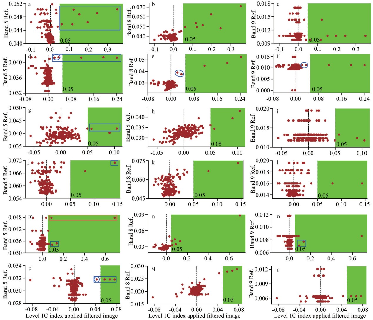Fig 2. Scatter plot analysis between indexMP calculated and convolution high-pass filtered Level 1C images and bands 5, 8, and 9 for 07/06/2018 referred to as AA (a–c), 18/04/2019 referred to as BB (d–f), 03/05/2019 referred to as CC (g–i), 18/05/2019 referred to as DD (j–l), 07/06/2019 referred to as FF (m–o), Cyprus (p–r)