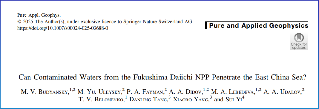 Budyansky, M.V., Uleysky, M.Y., Fayman, P.A. , Didov A. A., Lebedeva M. A., Udalov A. A. , Belonenko T. V., TANG Danling, YANG Xiaobo, and SUI Yi . 2025. Can Contaminated Waters from the Fukushima Daiichi NPP Penetrate the East China Sea?. Pure Appl. Geophys.