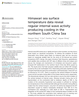论文全文:Xiaoyan Dang, Yi Sui, Danling Tang*, Jiujuan Wang, and Shengli Chen. Himawari SST data reveal regular internal wave activity producing cooling in the northern South China Sea, Frontiers in Marine Science, 2025.https://doi.org/10.3389/fmars.2025.1523449