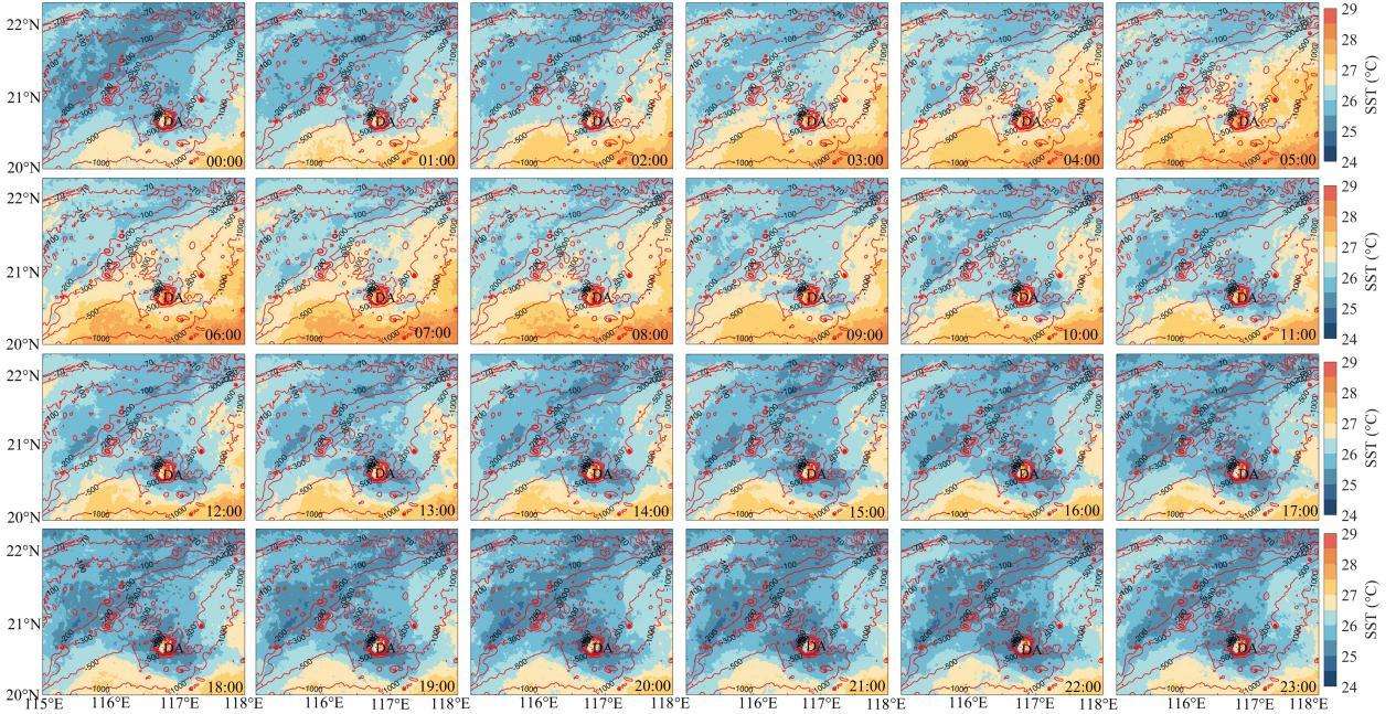 Fig 1 Hourly distribution of SST in the northwestern SCS, with bathymetric isobaths in red.