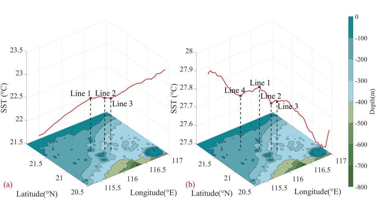 Fig 2 SST changes in the direction of propagation of IWs in (a) winter and (b) summer, with Line1 to Line4 showing the positions of landmark features during the advance of IWs.