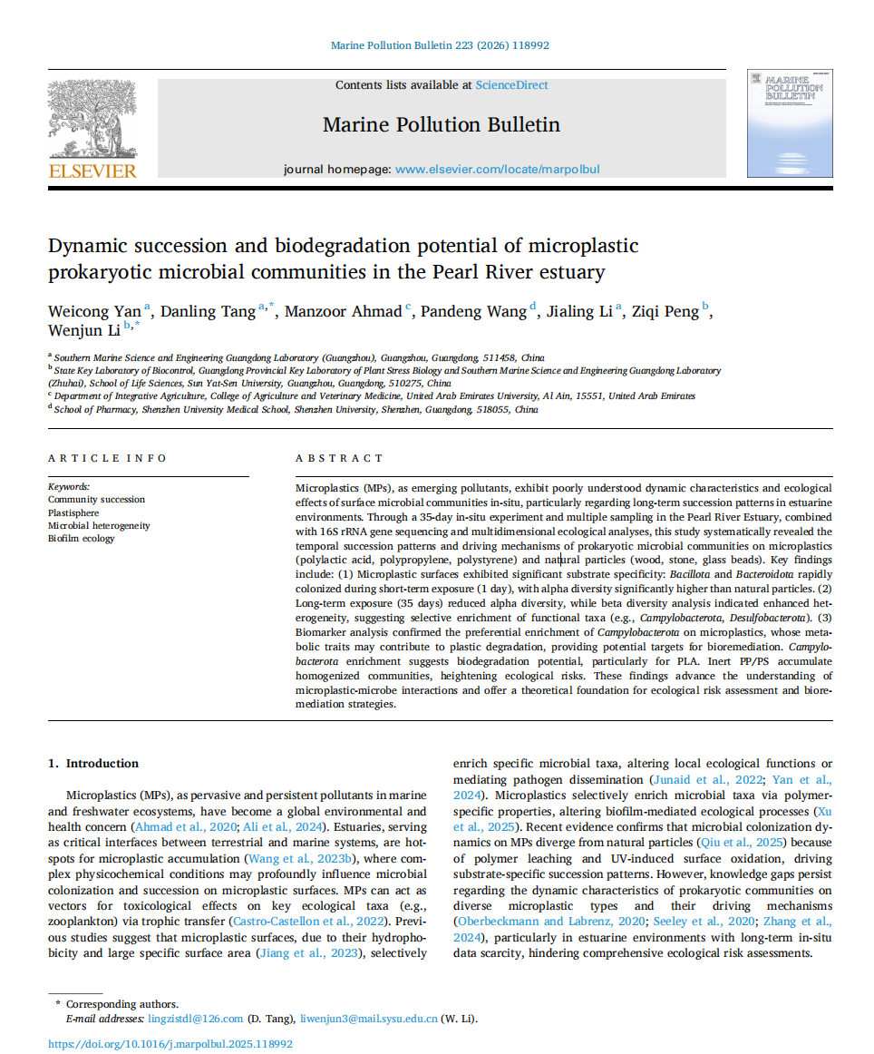 论文全文:Weicong Yan, Danling Tang*, Manzoor Ahmad, Pandeng Wang, Jialing Li, Ziqi Peng, Wenjun Li. Dynamic succession and biodegradation potential of microplastic prokaryotic microbial communities in the Pearl River estuary, Marine Pollution Bulletin, 2026. https://doi.org/10.1016/j.marpolbul.2025.118992