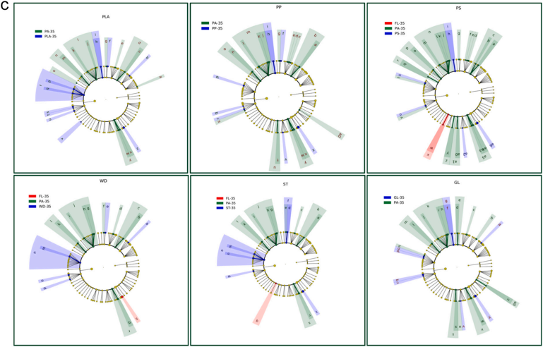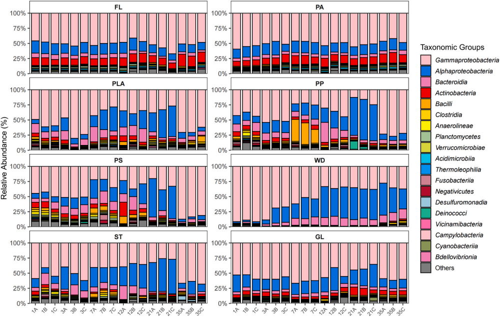 随着塑料制品的广泛使用,微塑料污染已成为全球性环境问题。在河口区域,微塑料不仅会长期滞留,还可能成为有害微生物的载体,对水生生态系统构成潜在威胁。然而,目前关于微塑料表面微生物群落的长期动态演替规律及其生态效应仍不清楚,特别是在复杂的河口环境中。团队在珠江口进行了为期35天的原位实验,通过16S rRNA基因测序和多维生态分析,系统揭示了微塑料(PLA、PP、PS)和自然颗粒(木头、石头、玻璃珠)表面原核微生物群落的时空演替规律。研究发现,微塑料表面表现出显著的基质特异性:Bacillota和Bacteroidota在短期暴露(1天)时迅速定殖,其alpha多样性显著高于自然颗粒。长期暴露(35天)后,alpha多样性降低,但beta多样性分析表明异质性增强,表明功能类群(如Campylobacterota、Desulfobacterota)的选择性富集。