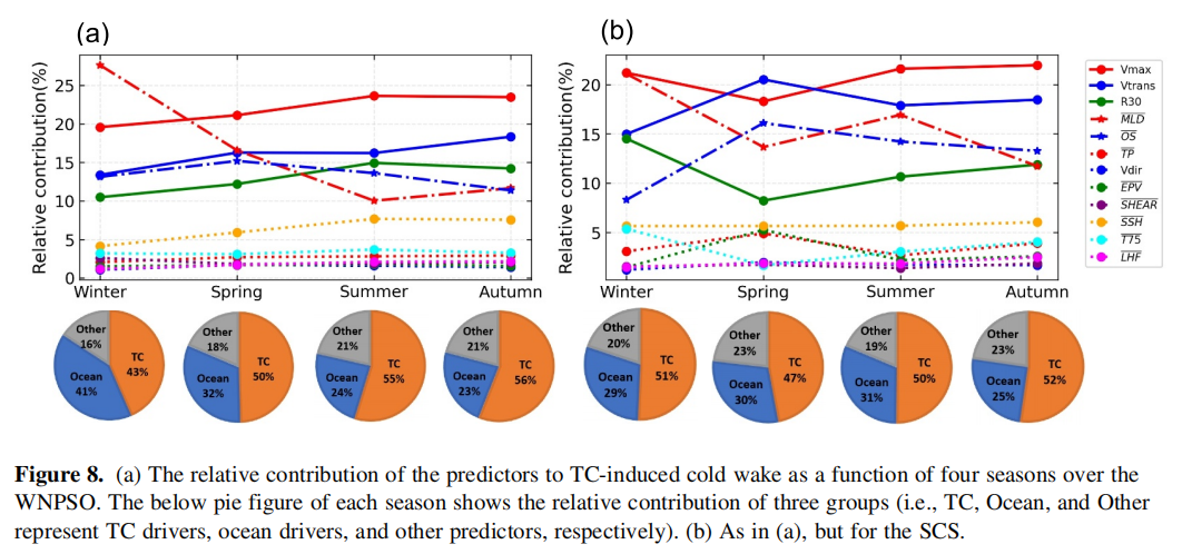 研究提出了一套可解释的机器学习框架,将极端梯度提升(XGBoost)与 SHapley Additive exPlanations(SHAP)相结合,用于解释西北太平洋热带气旋(TC)诱发的海表温度(SST)冷尾流的季节性与区域性差异。该框架采用 TC 特征(如强度、移动速度、半径)以及热带气旋经过前的上层海洋状态(如混合层深度、上层海洋分层结构)作为预测因子,能够有效重构不同季节与区域的冷尾流空间结构。该方法能够识别边缘海与开阔海域的冷尾流的主导因子,并结合季节与区域变化来系统量化各预测因子的相对贡献。研究结果表明,冷尾流的驱动因素随季节而变化:在开阔海域,TC 特征可解释冷尾流方差的 43%–56%,在边缘海中为 47%–52%;而TC前的海洋状态变量分别贡献 23%–41% 与 31%–35%。研究结果揭示了TC强度与混合层深度的季节性变化是导致边缘海与开阔海冷尾流季节性差异的最重要因素。