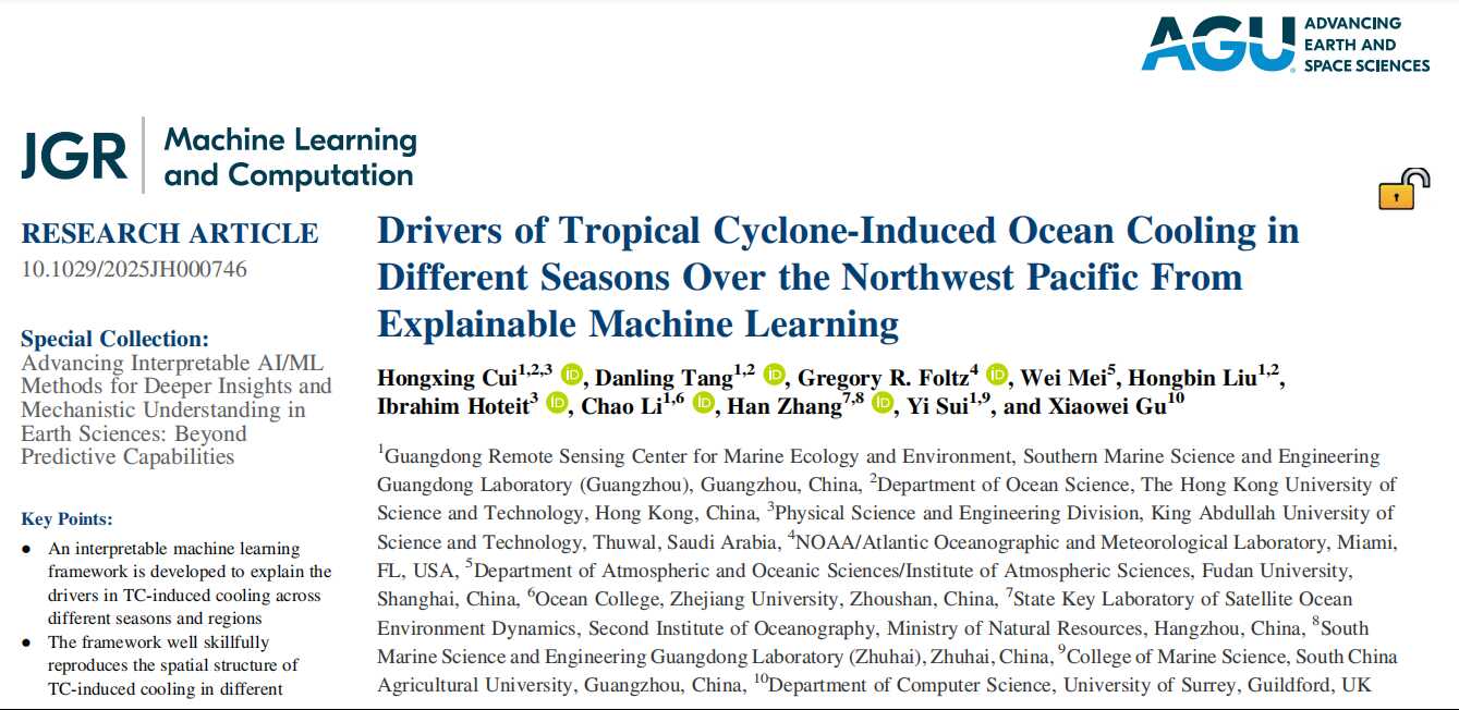 近日,广州海洋实验室唐丹玲团队在风泵生态效应方面研究取得新进展,研究结合可解释性AI识别了热带气旋诱发冷尾流的季节性驱动因子,相关成果以“Drivers of Tropical Cyclone‐Induced Ocean Cooling in Different Seasons Over the Northwest Pacific From Explainable Machine Learning”为题发表在著名期刊AGU 旗下的Journal of Geophysical Research - Machine Learning and Computation。