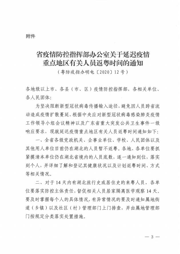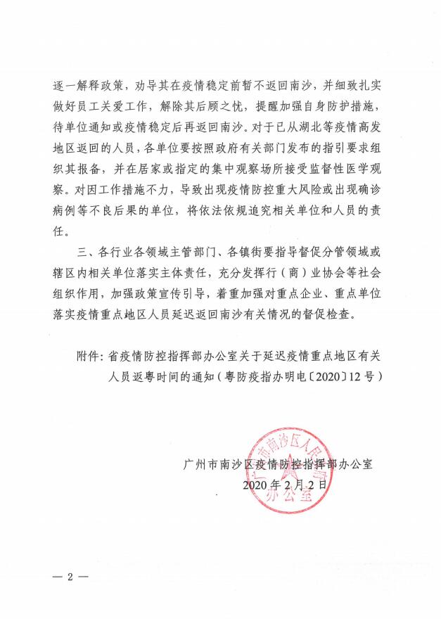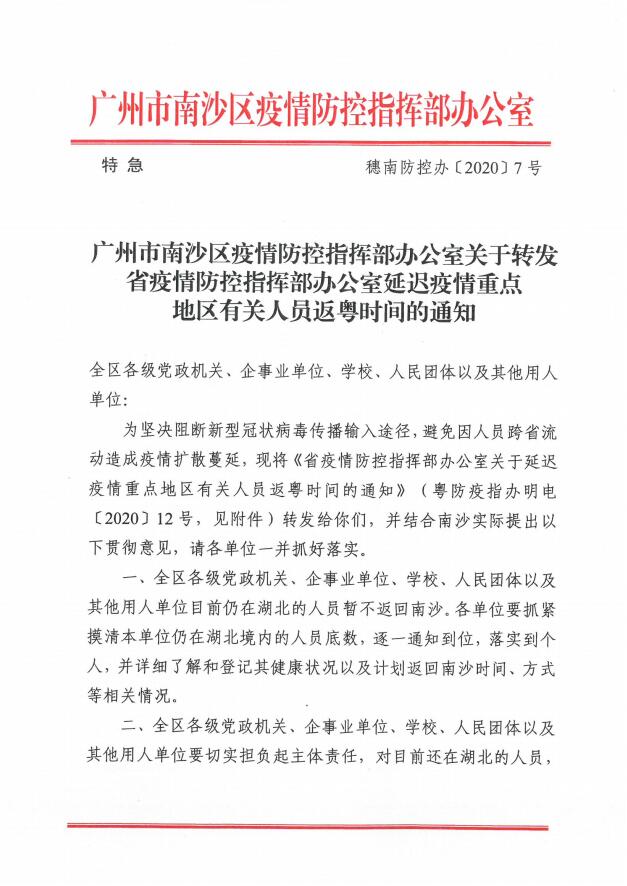 广州市南沙区疫情防控指挥部办公室关于转发省疫情防控指挥部办公室延迟疫情重点地区有关人员返粤时间的通知