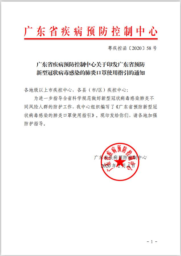 粤疾控函〔2020〕58号广东省疾病预防控制中心关于印发广东省预防新型冠状病毒感染的肺炎口罩使用指引的通知