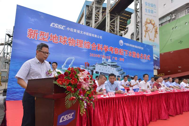 7月18日上午,新型地球物理综合科学考察船“实验6”号下水暨命名仪式在中船黄埔文冲船舶有限公司举行。中国科学院副院长、党组成员张涛发来贺信。中科院广州分院院长吴创之,中船黄埔文冲董事长盛纪纲,中国工程院院士、中科院南海海洋所原所长、广州海洋实验室主任张偲,中科院南海海洋所副所长(法定代表人)、广州海洋实验室副主任龙丽娟,党委书记、副所长詹文欢等出席活动。
