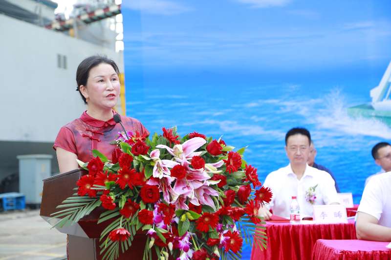 广州海洋实验室副主任、“实验6”号项目责任人龙丽娟为新型地球物理综合科学考察船命名“实验6”