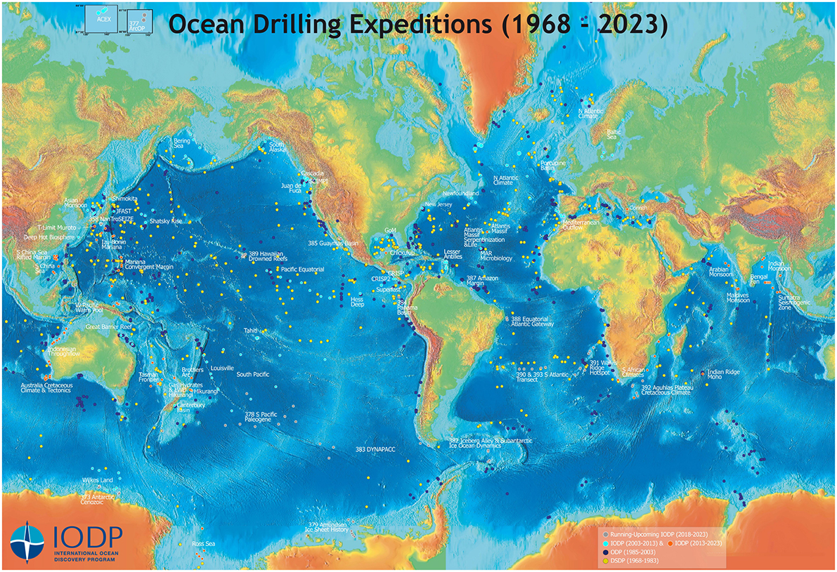 国际大洋发现计划(IODP, 2013-2023)及其前身综合大洋钻探计划(IODP,2003-2013)、大洋钻探计划(ODP,1983-2003)和深海钻探计划(DSDP,1968-1983),是地球科学历史上规模最大、影响最深的国际合作研究计划,旨在利用大洋钻探船或平台获取的海底沉积物和岩石样品和数据,在地球系统科学思想指导下,探索地球的气候演化、地球动力学、深部生物圈和地质灾害等。