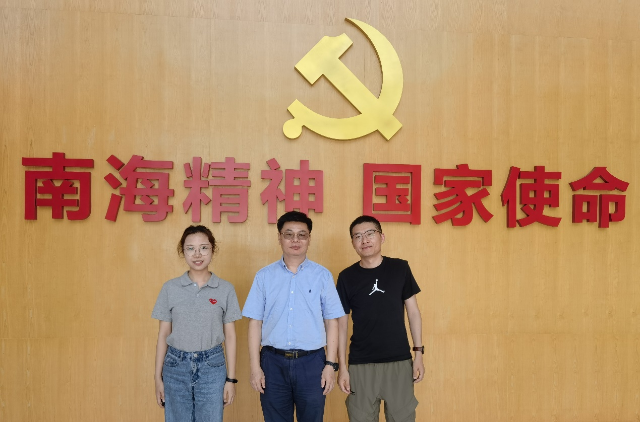 图:杨胜雄教授(中)、曹荆亚博士(右)和田冬梅博士(左)在广州海洋实验室合影