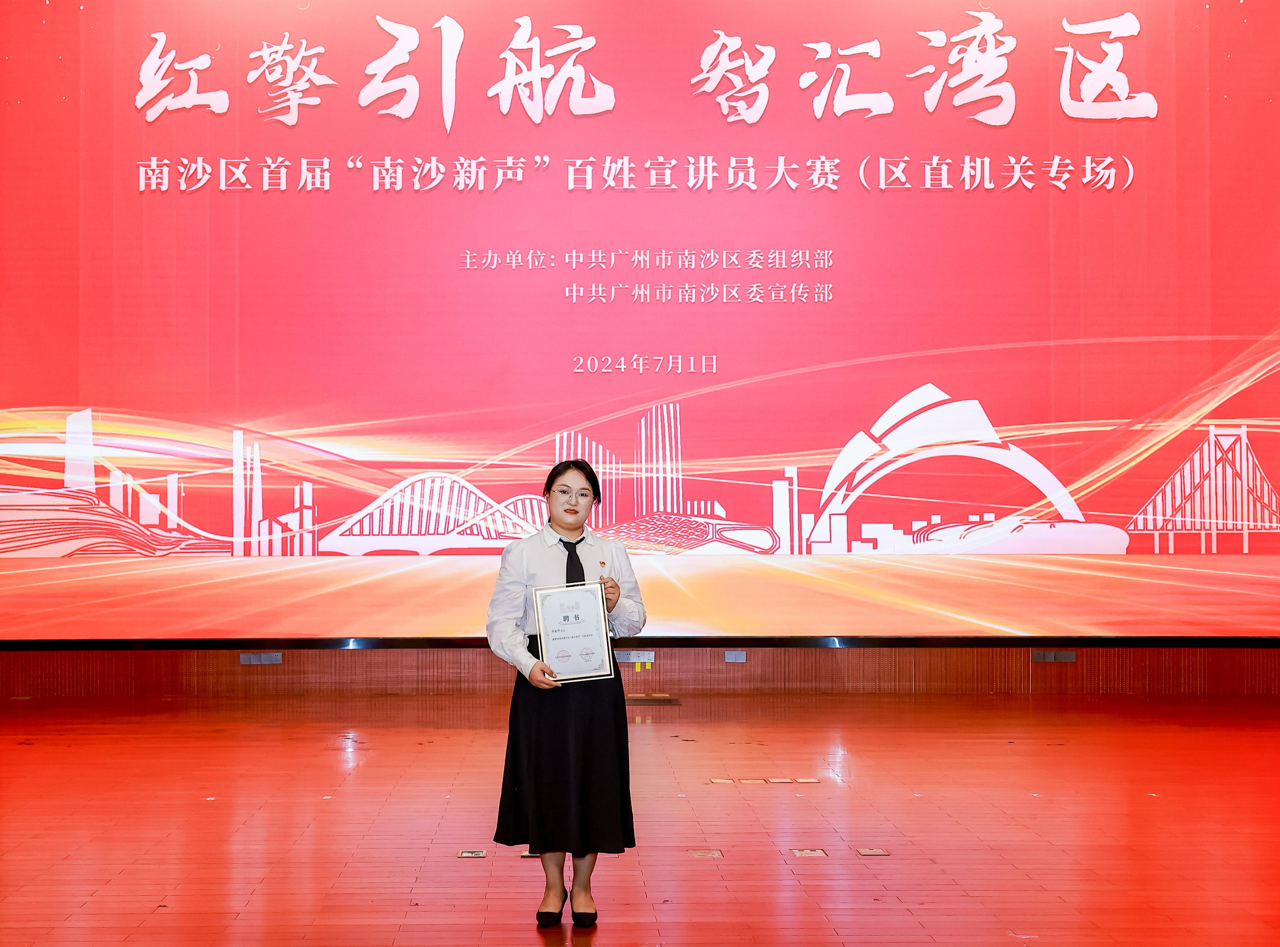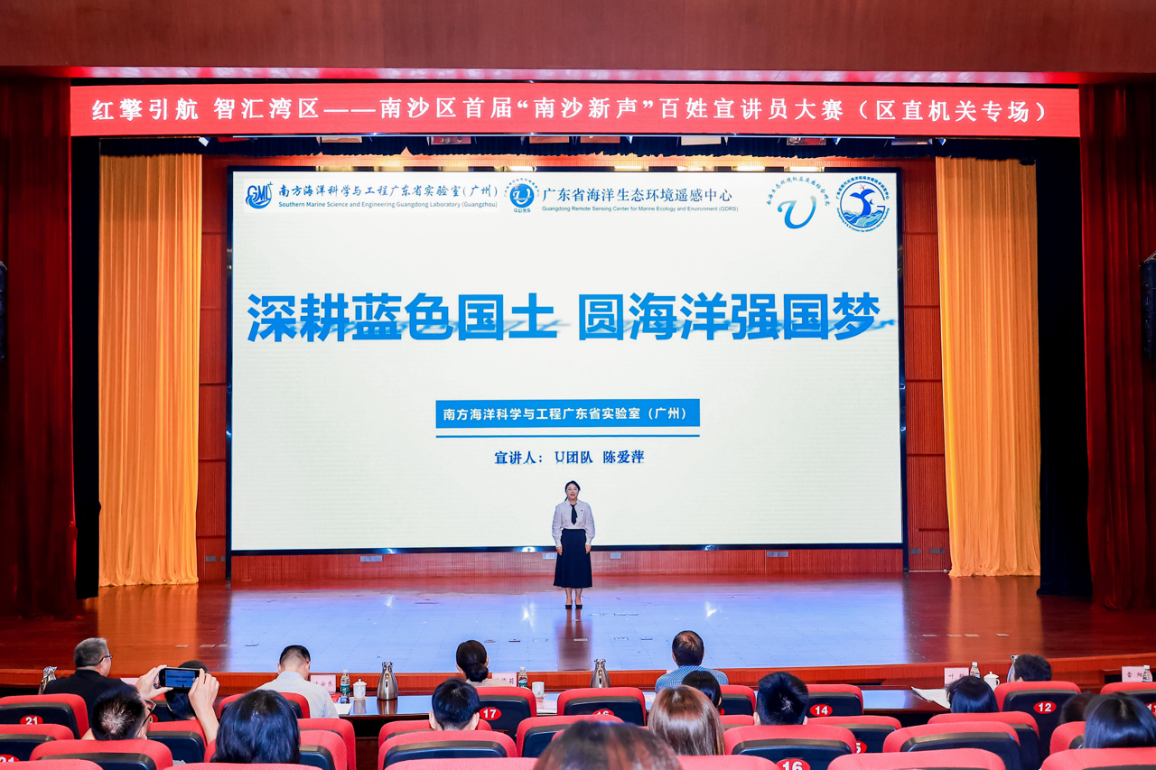 7月1日,由区委组织部、区委宣传部联合举办“红擎引航,智汇湾区——南沙区首届“南沙新声”百姓宣讲员大赛(区直机关专场)”在南沙区行政中心举行。广州海洋实验室南海U团队陈爱萍同志在选拔赛中脱颖而出,代表实验室参加此次大赛并荣获南沙区“南沙新声”百姓宣讲员称号。