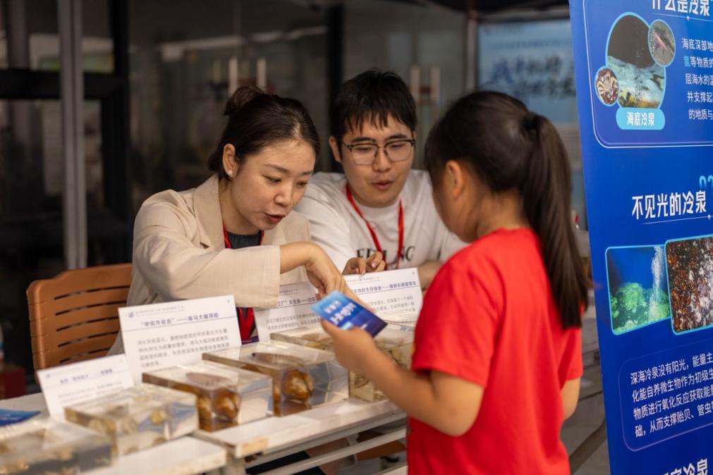在实验室展区,志愿者们向公众介绍了由我室牵头实施的“海洋十年”国际大科学计划——“海底甲烷渗漏对全球气候的影响”(CliMetS),以及“科学十年”国际大科学计划——“深海冷泉界面之谜”(MOCSI)。展区围绕深海冷泉主题,通过生物标本展示、趣味知识问答、深海视频播放等互动形式,生动揭示了冷泉生态系统及其特征生物的秘密,进一步加深了公众对深海资源与生态保护的认知。