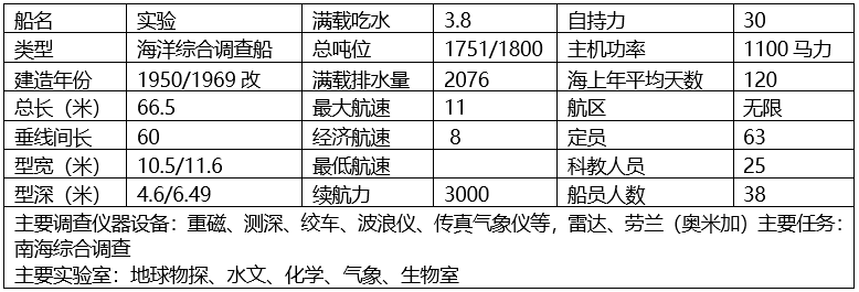 简介:原名“金井”, 1000吨级,钢质船舶,服役时间:1969年11月10日,报废时间:1982年3月25日,“金井”号,50年英国造,香港船籍贯,营运杂货和牲口,航线:新加坡---香港---日本,1967.7.28触礁搁浅于汕头海域,为船主所弃。1968年我所支付25万元广州打捞公司捞回买下,1969年底年改造完成,造船厂将金井号货轮改装成科考船。1974年5月10日~6月3日,实验号对西沙群岛进行了科学考察。1975年委托制片厂制作出版了科教片《西沙考察漫记》,1977年10月实验号对我国黄岩岛进行了科学考察,经过分析整理及实验,获得了不少初步研究结果及重要认识,研究相关成果刊登于1978年第20期科学院简报。